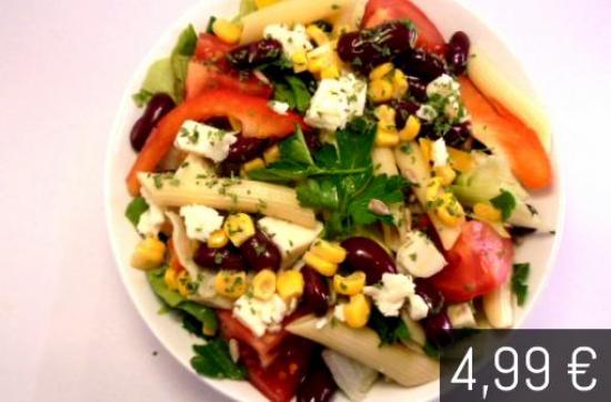 Frisch gemachter Veggie Salat Mexikanisch mit Kidneybohnen, Mais, Nudeln und Tomaten.